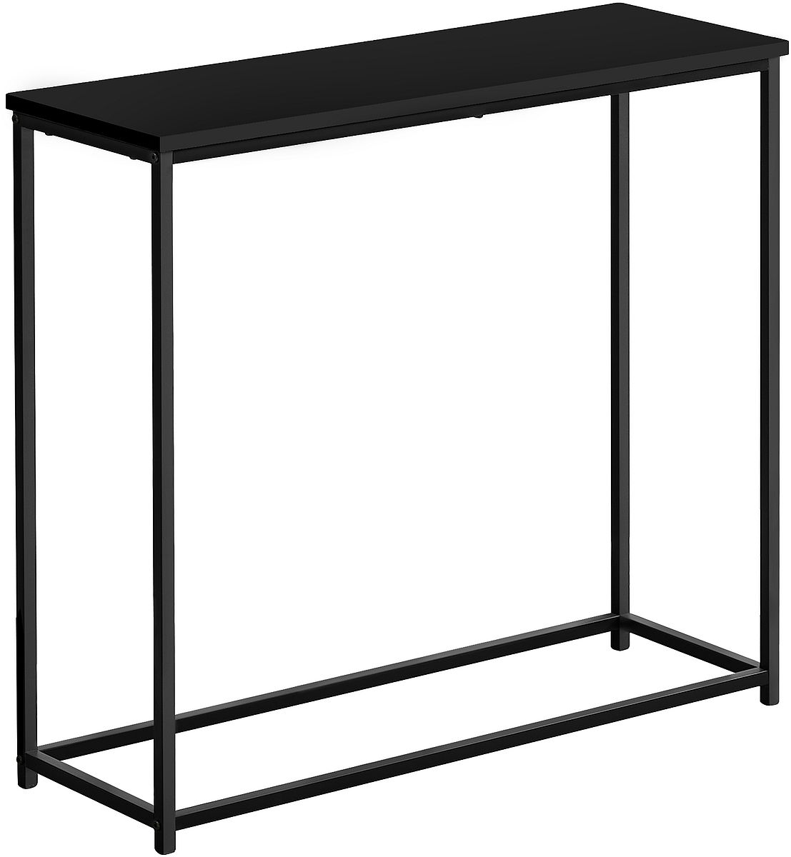 Finished on all sides, this contemporary hallway table with an open black metal frame, can easily be used in a variety of spaces such as behind a sofa, a small hallway, foyer or anywhere that needs that compact accent furniture to give a small space a little bit of flare.