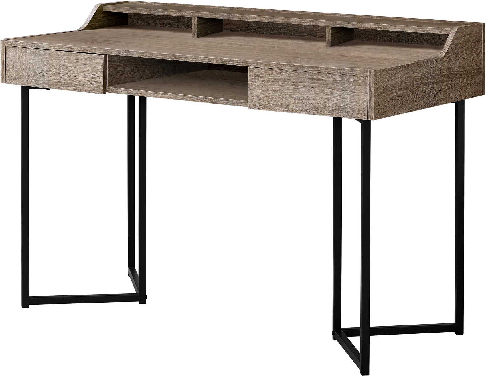 This modern style computer desk packs a lot of storage options in one sleek compact design. The spacious table top, made from durable MDF material, is finished in a dark taupe wood-grain look on all sides with ample room for a laptop, lamp, office supplies along with three open cubbies and a top shelf for your easy to reach essentials. There are two seamless storage drawers with a push-in mechanism and an open concept shelf in the middle to store a tablet, books, or magazines. The desk finishes off with bold angular black metal legs for a light contemporary feel. Place this space saving desk in any room for instant style with maximum functionality! Assembly is required.