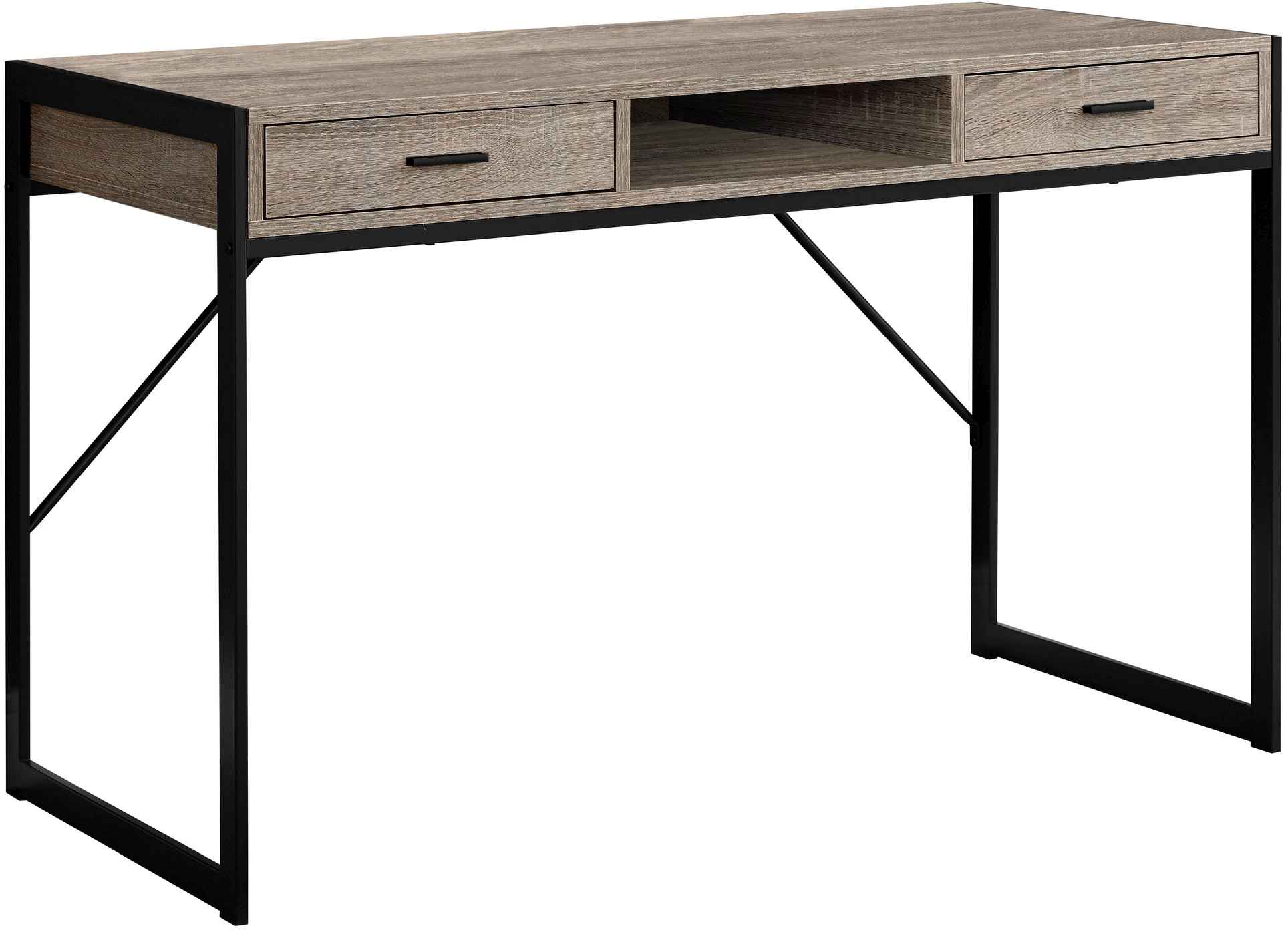 Combining function and style, this contemporary computer desk will be an instant standout in your home office. The spacious desktop finished in a warm dark taupe wood-grain look on all sides with black accents, includes two drawers to store away notepads, books, office supplies and an open concept middle shelf for papers will keep you neatly organized. Strong, square black metal legs and frame support the desk for a chic modern statement. The space-saving design is an added bonus that can easily hold your laptop, a lamp, a picture or plant to round out your personal office space. Assembly is required.