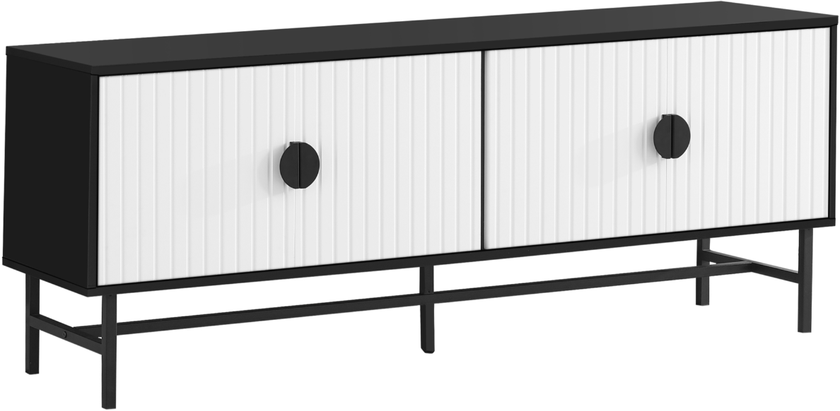 The sleek and stylish modern design features a black and white laminate finish with white ribbed doors and a sturdy black metal frame with black metal knobs