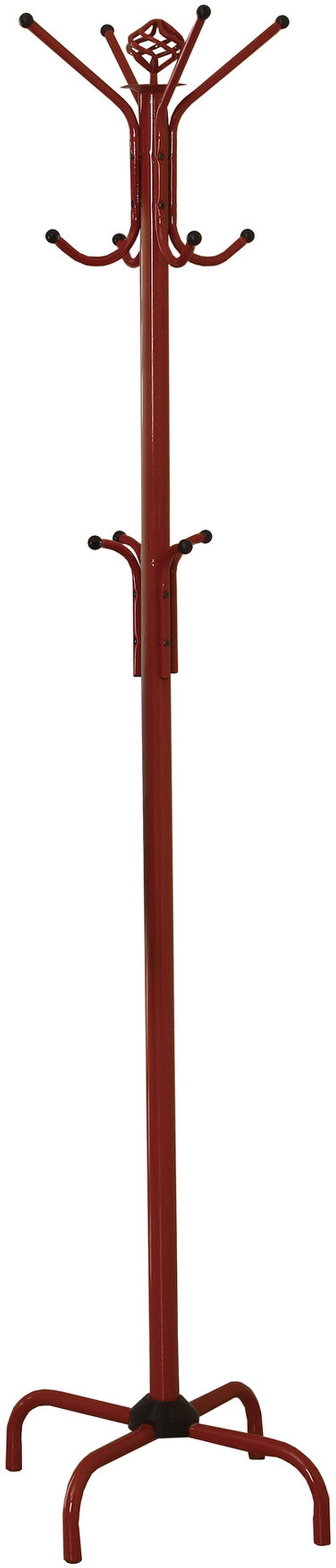 Freely hang your hats, scarves and jackets on this practical coat tree finished in a trendy red metal. Natural and smooth, the coat rack's wide base will help evenly distribute the weight of all your apparel so you don't have to worry about tipping. Ideal in offices, entrances, bedrooms or more, the versatility of this standing coat rack is endless featuring 12 hooks on a double tier format. Your ideal coat rack in small spaces, this model is perfect in the entrance, bedroom or office.