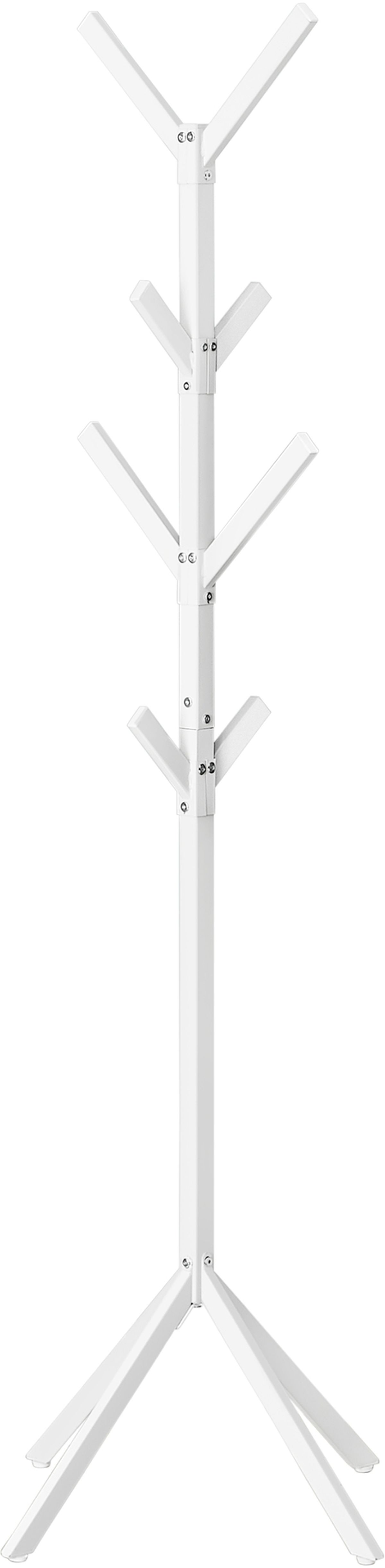 Get those coats and scarves off the chair and onto this modern, industrial style metal coat rack! Featuring 4 tiers of 8 hanging hooks that easily hold coats, drape your scarves, or hang some beautiful purses as a unique and stylish storage solution. The sturdy 4-pronged base helps to keep the weight properly distributed. With a chic white matte finish, this coat rack will anchor that corner of your entryway, bedroom, and your office for a strong, contemporary look. Assembly is required.