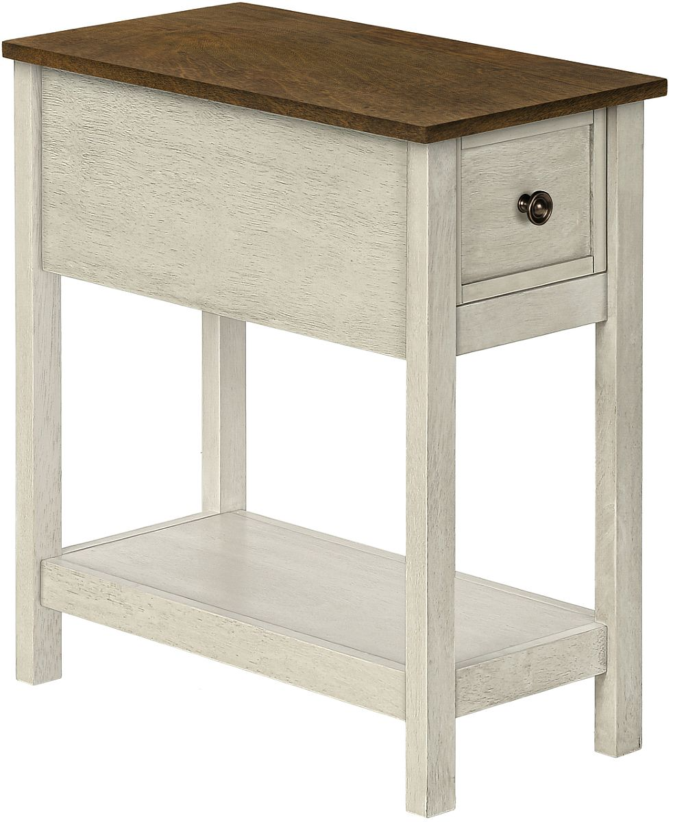 With its narrow profile it can be set next to an armchair or sofa in a living room with a small lamp or decorative objects on the easy to clean top, or as a charming nightstand in the bedroom. This two-tone table with an espresso brown veneer top and antique white veneer finish with sturdy straight solid wood legs brings some warmth to a space. The storage drawer on easy metal glides is accented with a bronze metal knob and the roomy bottom shelf allows you to conveniently keep essentials organized and within reach. Durably designed with quality materials, this practical end table with fashionable style is backed by a 5-year limited warranty against manufacturer's defects for your convenience. Easy to assemble with illustrated instructions, all hardware and floor protectors included so you can have this versatile accent table setup and ready to enjoy.
