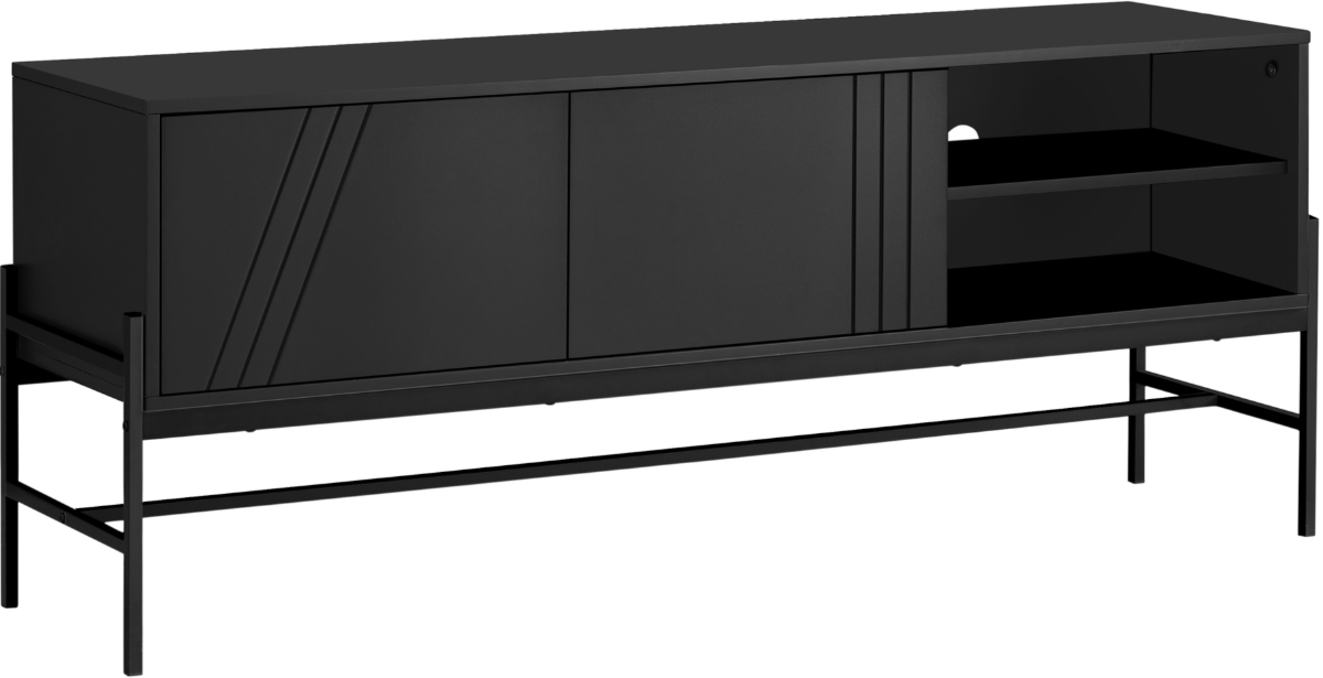 This fashionably stylish 60-inch (152.4 cm) contemporary TV stand is solidly constructed with black laminate and black metal for a modern statement in a living room, bedroom, or office