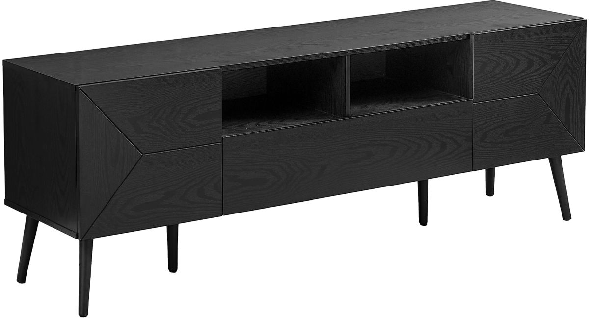 A highly functional 72 inch tv stand console unit with a smooth, black laminate finish in a mid-century, retro style and abundant storage options.