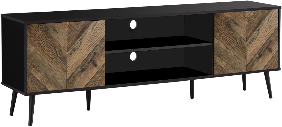 Make a modern statement and stay organized with this 72 inch tv stand. Featuring a brown and black laminate finish with durably designed black wood legs, and slanted groove lines on the wood-look doors give this tv console unit a unique and stylish contemporary flair.Read More