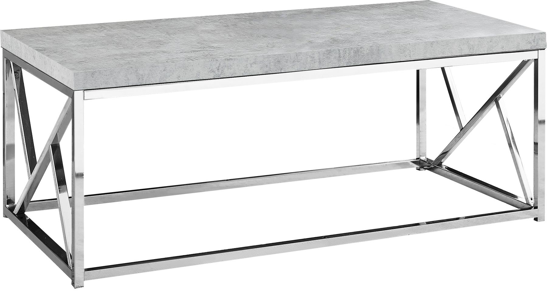 With an industrial inspired chic grey cement look tabletop and a stylish thick paneled design, this beautiful cocktail table gives an exceptional look to any room. The modern rectangular shape and crisscross chrome metal design provides sturdy support as well as a contemporary look. Use this multi-functional coffee table to compliment your living space.