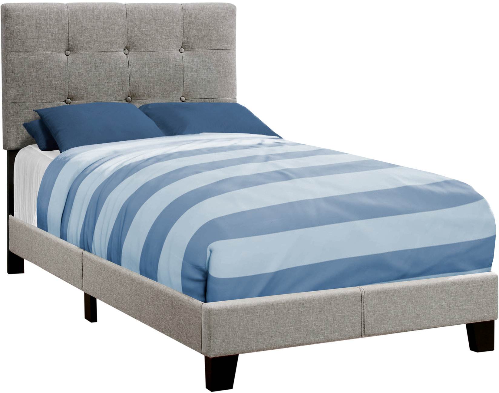Low profile twin bed frame upholstered in a beautiful grey linen look fabric; padded headboard boasts an elegant tufted design