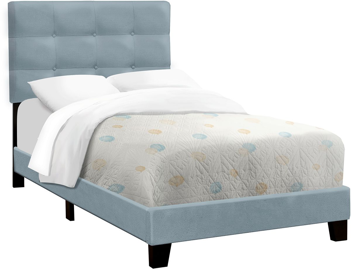Trendy and chic twin size platform bed frame in a transitional design, upholstered with a light blue velvet soft touch fabric for a fashionable bedroom upgrade